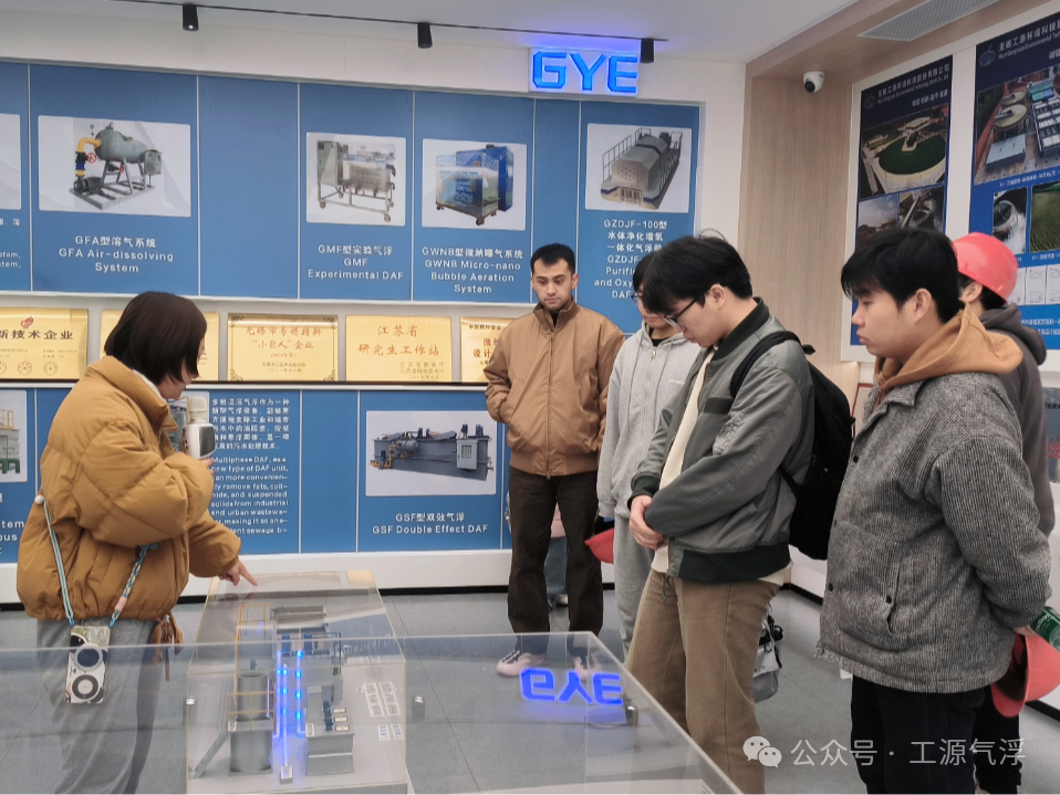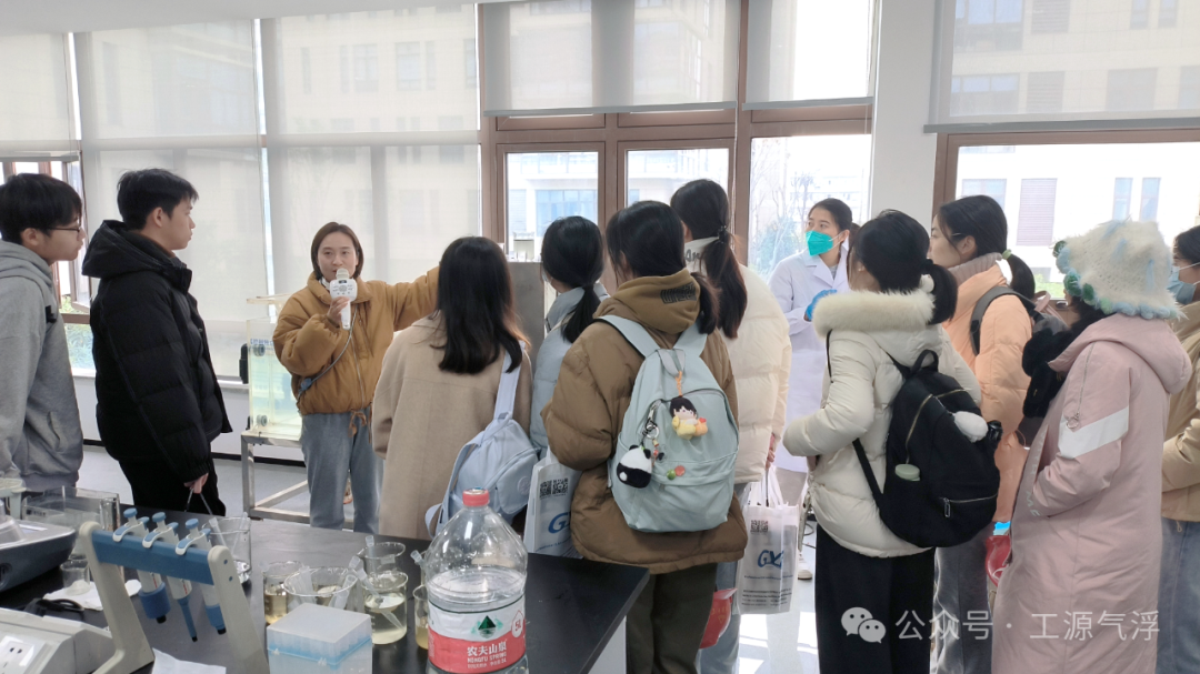 工源公司董事长兼总经理孙连军、总经理助理孙敏贤共同接待来访同学,带领大家参观了工源综合展示厅与气浮工艺研发实验室,并就公司发展历程、气浮种类与原理、气浮应用场景以及气浮工艺实验室免费向外界开放的初衷,为同学们进行了系统讲解。